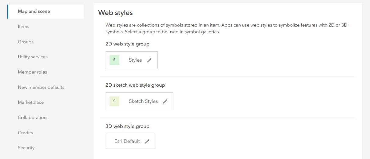 Sketch users have been able to add web styles directly to sketch from ArcGIS Online for a while, but we received feedback that users would like to be able to set an organization level web style group up for sketch, just as they can when adjusting layer symbology from the Styles pane. Sketch now supports a sketch specific web style group that can be configured under the Map section in your Organization settings. For information on publishing and preparing a web style group, please refer to this blog article. The only difference is that you will reference the group with your desired Sketch symbols in the 2D sketch web style group instead of the 2D web style group (You can also reference the same group in both categories). Once your group is set up, the symbols will be availble in the Sketch symbol gallery for all users in your organization. This allows easy access to symbols your organization regularly uses.