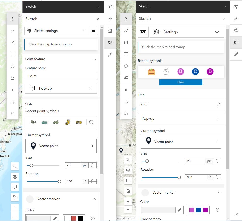 For this release, the overall design of the sketch pane has been improved for easier navigation. Recent symbols have been moved into a new Style section and feature title has been renamed feature name to reduce confusion with the pop-up title. See if you can spot all the changes in the new version (left) below.