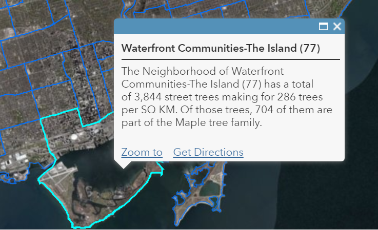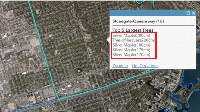 If you add the expression above to the Neighborhood layer, and then put that in a custom pop-up with a nice header (“Top 5 Largest Trees”), it might look something like this. The red box below shows the Arcade expression portion.