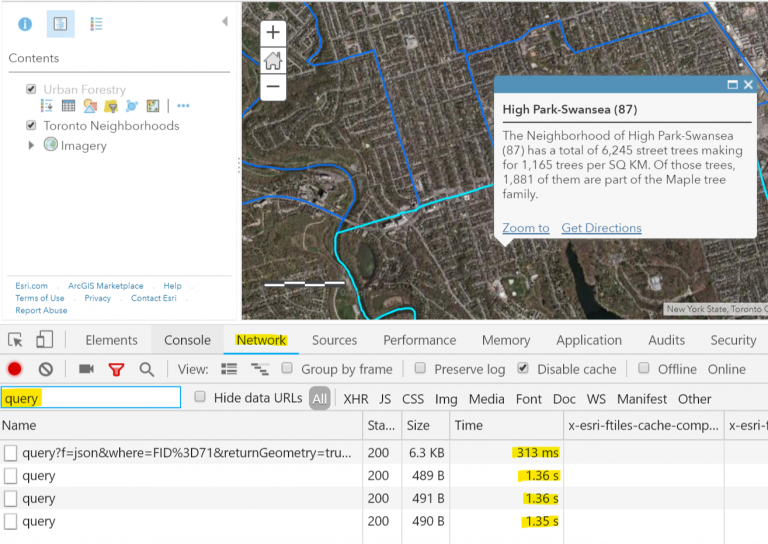 The first 2 expressions are using an identical FeatureSet and therefore the same query. In order to load the pop-up, the expression executes 2 identical queries, plus a 3rd unique query. In the following example from Part 1, we could adjust the pop-up to use a single Arcade expression and improve the performance by reducing the number of queries to the trees layer from 3 to 2.