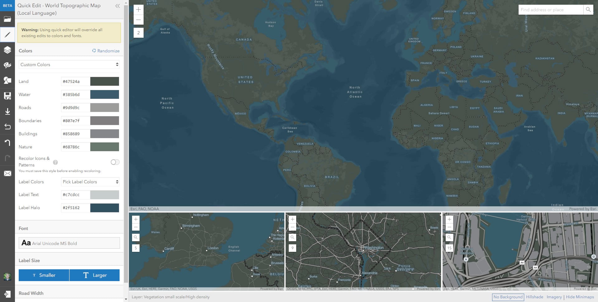 Here are three different vector basemaps I made using these palettes, in about five minutes total, by searching words like sea, clay, forest, emerald, moss.