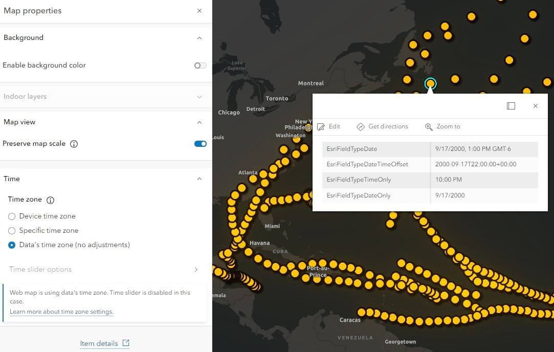 If you are familiar with ArcGIS Pro’s experience with displaying date time you will see that no adjustments are made to the time. If the layer is published with a preferred time zone, Pro will display the values following that time zone set on the layer. When you set the web map to Data’s time zone you will see that the map will now honor the preferred time zone and no adjustments are made in the display of the date values. In the case where no preferred time zone is set the date fields will be displayed in UTC. If you have a case where multiple layers have different preferred time zones they will honor what has been set in the service. Currently some experiences will be limited when using the Data’s time zone. Specifically you will see time slider disabled at this release but we are working towards supporting this in a future update.