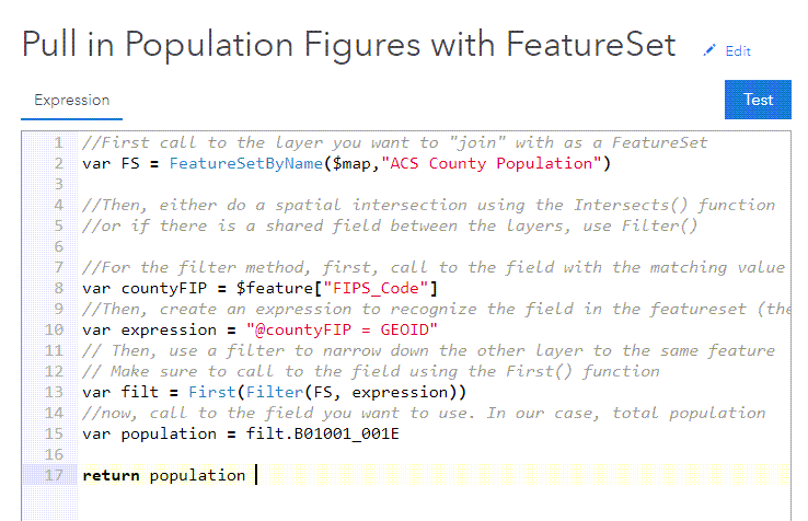 To get the population data value from the ACS layer and bring it to the Census of Agriculture map, we can use an Arcade FeatureSet like in the previous examples, but we are going to access the data using the Filter() function instead since there’s a similar field between the two layers. This method is generally faster than a spatial intersection because it is a more straightforward request from the hosted service. Using a SQL expression to filter the ACS population layer, we can then access the first (and only) matching result for each FIPS, and then call to the field we want using a dot notation: