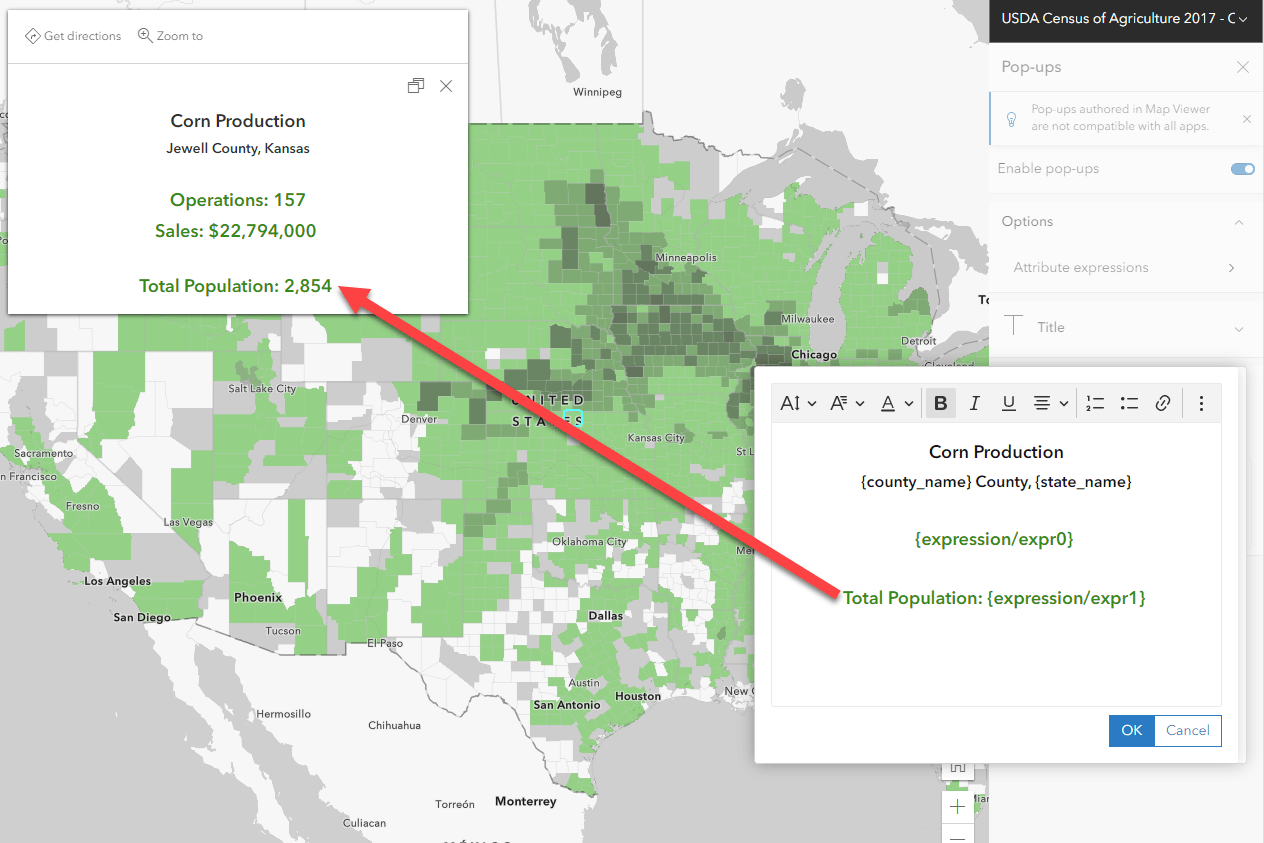 To see the example above and the settings used, visit this web map and view the expression within the Census of Agriculture layer pop-up.