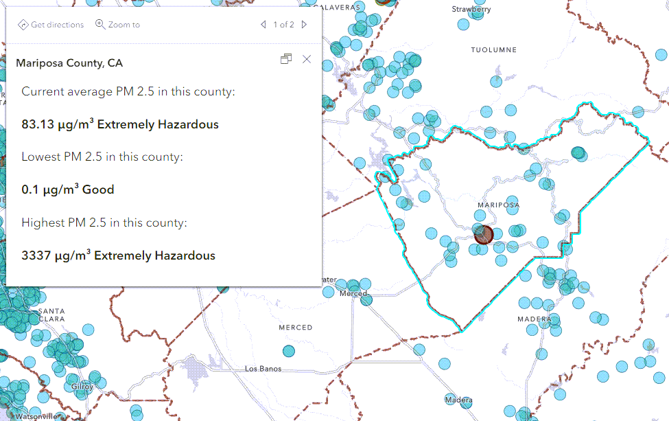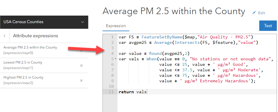 The map below contains three expressions summarizing the PM2.5 values: one for the average, one for the minimum, and one for the maximum PM 2.5 within each county. Using an approach similar to the one in the previous example, we can not only get key statistics, but return the values with a meaningful key phrase communicating if the PM2.5 is considered good/hazardous/etc.