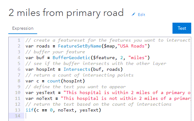 The example below uses a FeatureSet to call to the Roads layer, buffers each hospital by 2 miles, and then check if the two features intersect. If the count of intersections is 0, it specifies that the hospital is not within 2 miles of a major road. If the count of intersections if over 0, this implies that the features intersect.