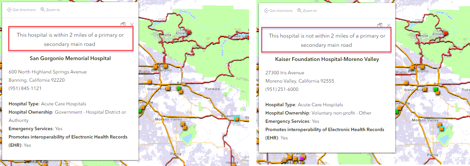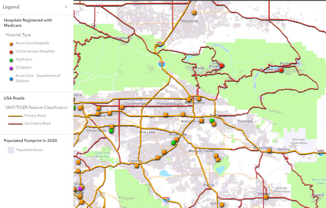 For example, if I wanted to see which Medicare hospitals were within 2 miles of a primary or secondary main road, I could easily calculate this with Arcade.