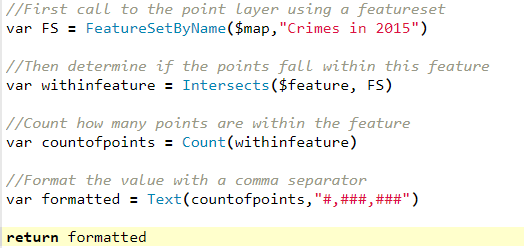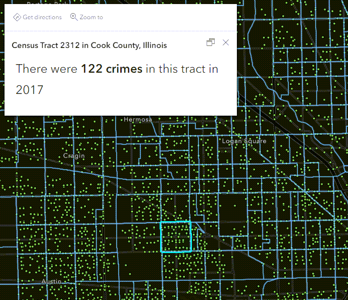 For example, if I want to summarize how many crimes happened within each Chicago Census tract in a month, this can be done in a few lines of Arcade on the tract layer (the layer you want to click on and summarize information to):