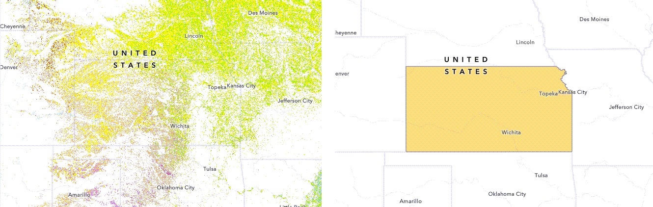 You can also use this technique with raster datasets. Imagine if I want to show the cropland in the state of Kansas. I can use the US state boundaries layer from Living Atlas and filter it to show only Kansas. If I overlay the Kansas boundary on top of the USA Cropland layer from Living Atlas and apply the Destination Atop technique, I get similar results: