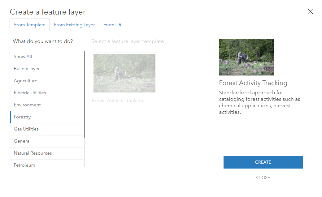 Step 3: Select Forestry from the list on the left, choose the Forest Activity Tracking template, and click Create.