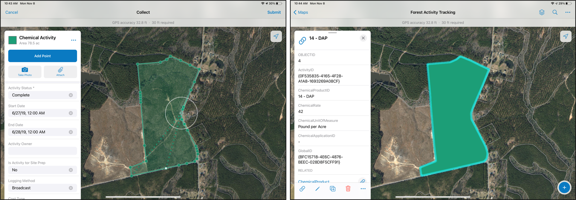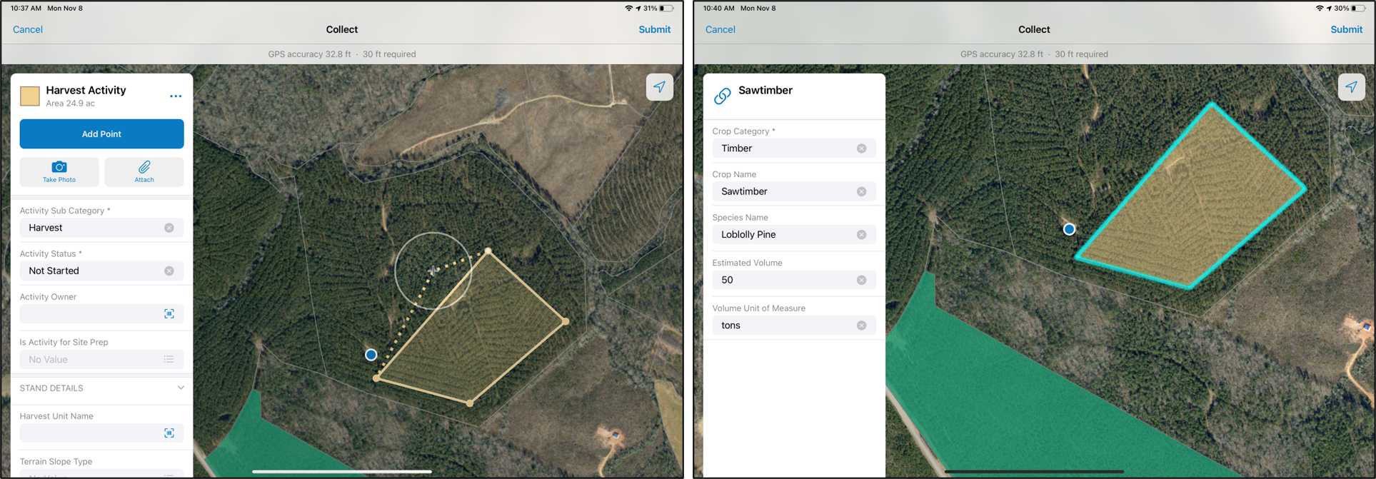 Our forest activity tracking template is ready for use. Existing data about your timber tracts and stands may be loaded into the template for reference. Now you are ready to take the template into the field with Esri mobile apps to start collecting data about harvest activities, chemical treatments, and their associated details.