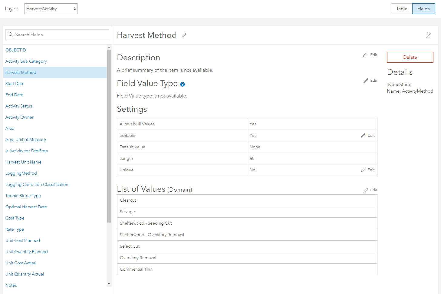Click on a field name to open up the field details. Here you can manage the settings of the field and control how values are entered and stored. Some fields include pre-populated domains that help ensure data integrity during field collection. In some cases, you may want to change the values, enter in your own, or remove them altogether.