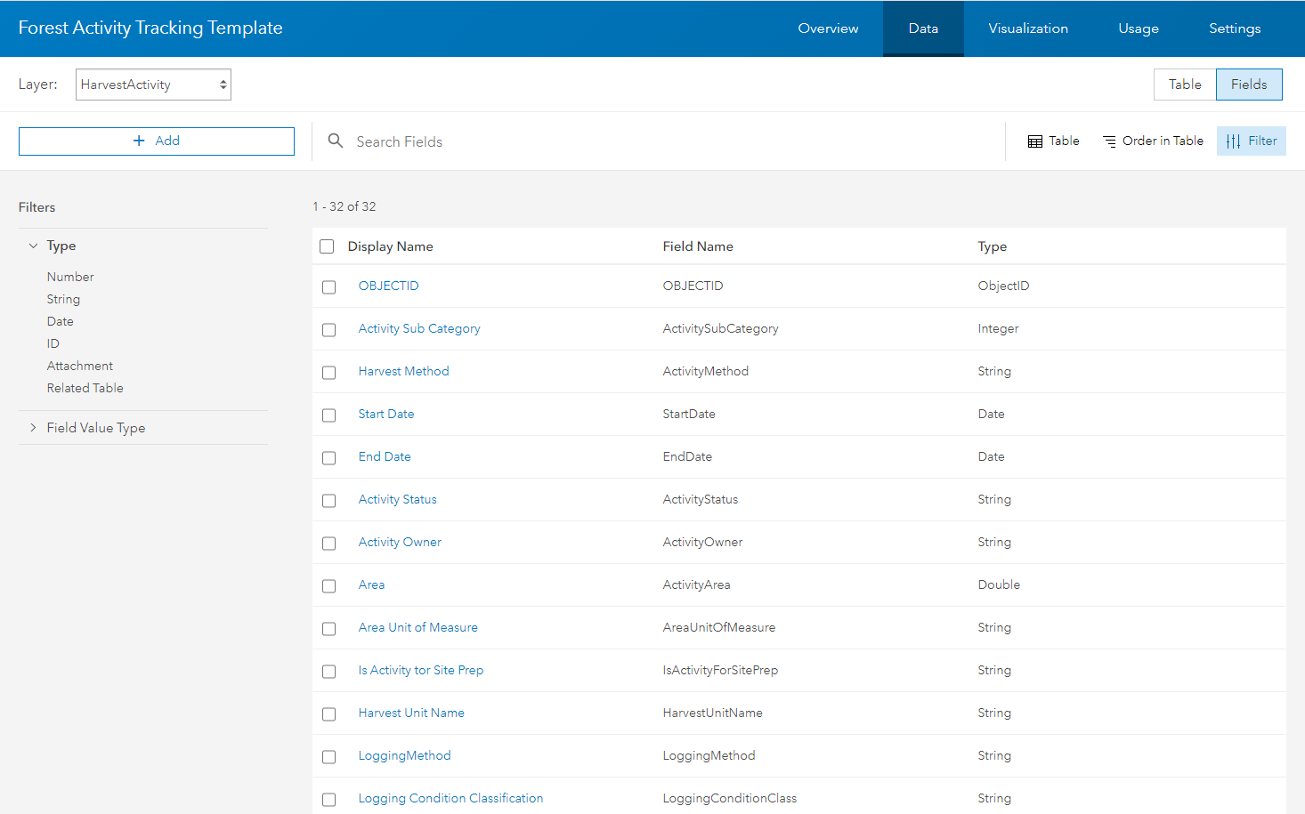 Step 8 (optional): To modify your layer, toggle the view from Table to Fields. Here you see a list of all the fields with their field name and data type. To add a field, click + Add.