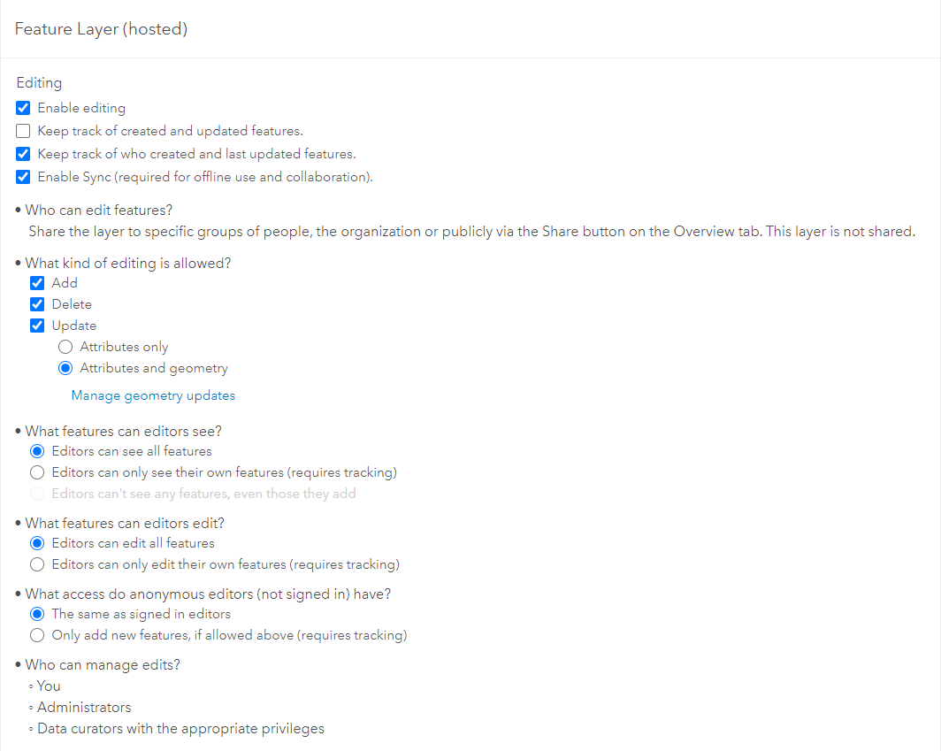 Step 7: In the item details under Settings, ensure your new feature layer is editable by selecting the appropriate options for field data collection. You should have Enable editing and Enable Sync selected by default. You can choose to enable editor tracking and configure additional editing details.
