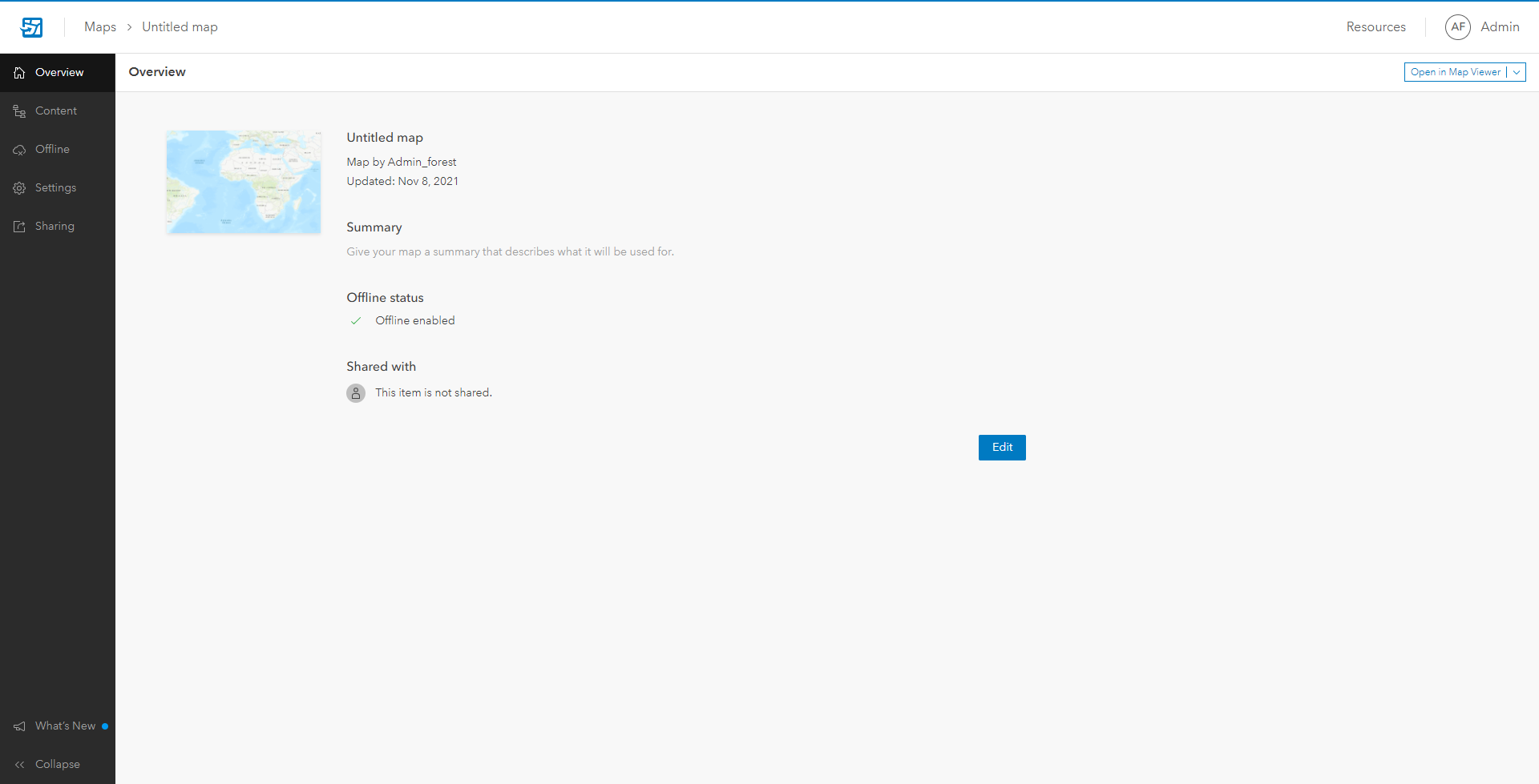 The overview tab shows the details of the web map along with the offline status and how it is shared. For the purpose of this exercise, we will not go into details around map configuration. Reference this documentation for more information.