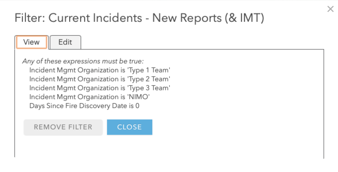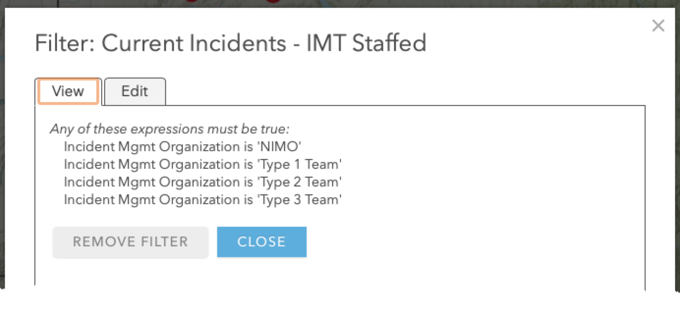 The first filter is specifically for when you are viewing more than one state at a time on the map. At this scale I only want to see the fire locations that are reported to have an Incident Management Organization (IMT) as shown applied on the right. A fire having such a team assigned often means there is a level of complexity that warrants this group of specialized staff to manage the response. This attribute provides a good way to filter away smaller or less complex incidents at this scale.