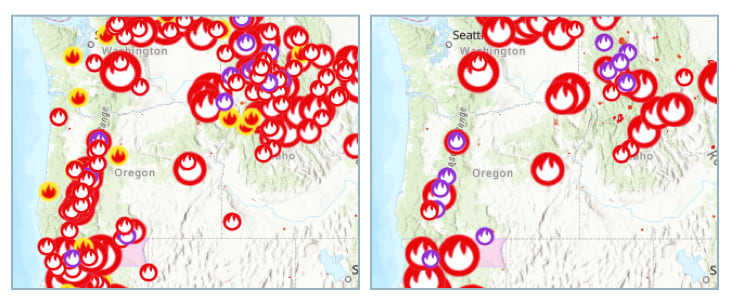 Earlier this year we updated the symbology of the wildfire layer hosted in the ArcGIS Living Atlas of the World. This helps to differentiate between the types and sizes of fires. However, when zoomed out to the entire western US, I find the large number of fires showing on the map to be overwhelming. While new fires (Past 24-hours) do not always become large fires, they do stay on the map until they meet fall-off rules. This sometimes results in making it appear as if the entire west is aflame.