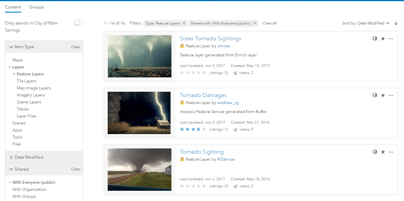 With the updated design, you can perform a focused search of content through the content search, or search all of ArcGIS Online, using the global search. With the tabbed design in the global search, you can use the filter functionality to refine your searches for content, as well as groups. So get wild and start thinking of great content searches like Public Feature Layers about Tornadoes.