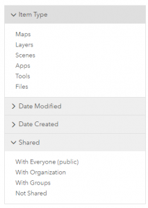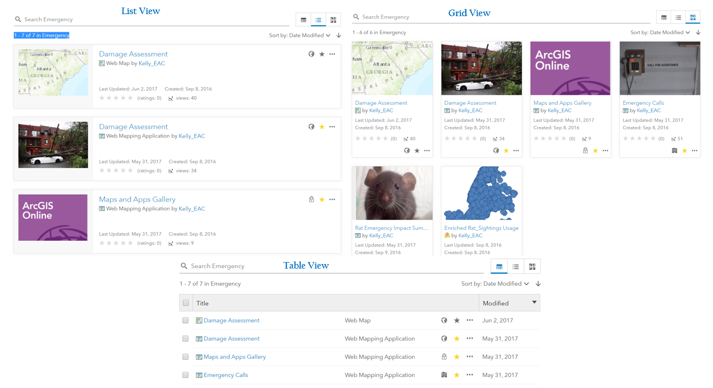 Ever wish you could view your content as a set of thumbnail images, like on the Gallery page, instead of in a table? Now you can. The new Content tab provides three options for viewing content: Table View, List View and Grid View. Each view shows the content in a different way, displaying helpful information for each item, like the thumbnail, ratings, and sharing status. In My Content, you still can navigate to your individual folders, but a new option lets you view all your content across all folders at the same time. And, you will be able to rename your folders too! So, if you can’t remember which folder your map is in, simply view all content and search for the map. In a similar way, you can browse all content across all groups you belong to.