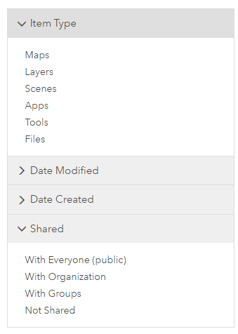 You can further refine your searches by using the filters provided on the left side of the page. For example, you might be looking for a web app with a particular name created last week that is shared with the organization.
