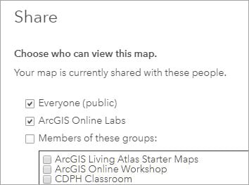 Step 1 – Save and Share your map. To share with others you must share your map publicly, or within your organization. Limit sharing to within your organization only if you want to quick-share privately with another member.