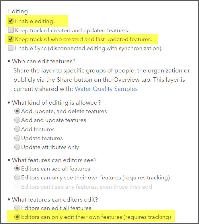 - Enable editing, editor tracking in the feature layer settings. (Editor tracking will record the students username and date when the features were created and modified)