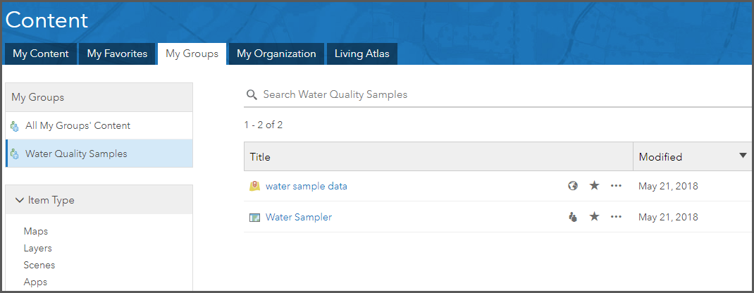 - Share the web application and supporting items such layers, webmaps and files with the created group to give students access to the items.