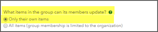 When creating a cross-organizational sharing group, ensure that group members can only update their own items option is selected in for the last group setting (default setting). If the setting is changed to All Items, group members are given the ability to make updates to feature layers and web maps regardless of the item settings. Only organizational members can join groups with this capability, sometimes called an update capability group. It is not possible to invite users from another organization to a group if members can update all items and this setting cannot be changed after the group is created. Moral of the story, don’t change this default setting if you want to invite members from another organization to the group.