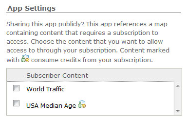 When you publish a web map with subscriber content to one of ArcGIS Online’s configurable web applications you’ll see a new section in the app’s configuration panel that lets you enable public viewers to access that content via your subscription. Premium layers accessed by public viewers will consume credits from your organization’s subscription.