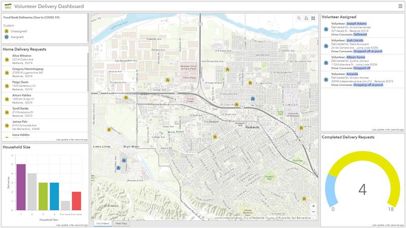 Amanda Stanko works at Esri as a solution engineer. Stanko has been volunteering with the Inland Empire Food Bank for two years. She wanted to get involved and put “GIS” As a special skill in her volunteer form. She’s been working with Mercado’s team ever since. “We all started brainstorming, how can we put a system together that would take the stress off the administrative side and use maps and location intelligence to streamline the process”. Stanko worked with Mercado to develop a new homebound delivery system, all using Esri’s mapping platform. Using the system, volunteer forms, as well as requests for assistance from the website fill into a web-based application where volunteers can easily see if there are any home deliveries in need near their location, assign themselves, and get on the road.