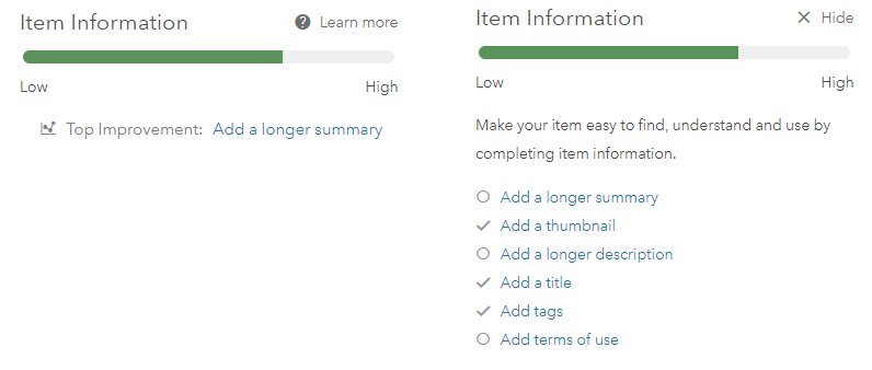 Content consumers often judge the quality of an item by the quality of the information they find on the item page. As you author the item page, the new “Item Information” status bar provides you feedback on areas that could use work.