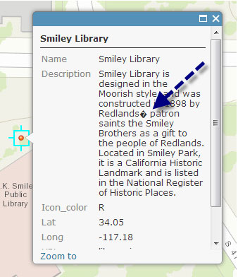 When importing .txt or .csv file in your ArcGIS Online web map something to consider is the use of smart quotes and apostrophes (also called “curly” or “book”) vs. plain ones. For example, if smart apostrophes are used, you will see unrecognized characters displayed in your pop-ups, like shown below: