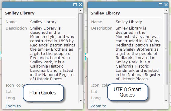 Below is the same pop-up as shown at the beginning of this post, using plain quotes on the left, and UTF-8 smart quotes on the right.