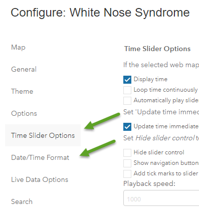 The Time Aware configurable app includes a slider that enables the viewer to play, pause, and interactively move forwards and backwards through time, depending on how it has been configured. The primary tabs for controlling slider functionality and appearance are Time Slider Options and Date/Time Format, found along the left side of the configuration panel.