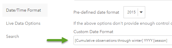 To add text, go to the Date/Time Format tab, and in Custom Date Format construct a string for the slider label. The Date can be expressed in a variety of standard formats, such as YYYY or YYY-MM-dd, and text can be placed within braces – [ and ]. Since our time animation settings were also cumulative, we used the following string in Custom Date Format:
