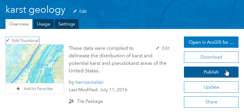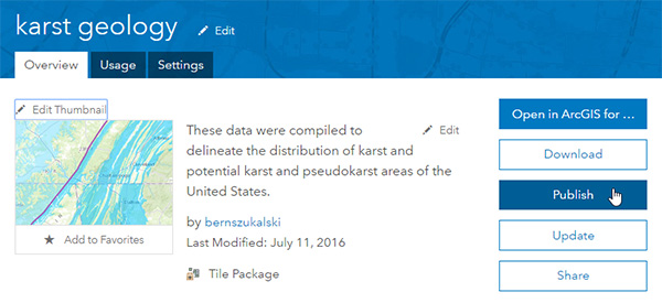If you have not previously published the tile package, open the item details and click Publish. Note that you will need publish privileges to create hosted layers.