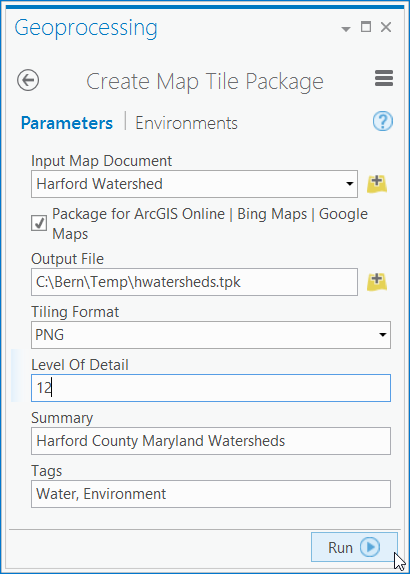 Step 4. Create the tile package. Complete the information and options in the Create Map Tile Package tool pane, then click Run.
