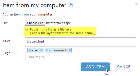 Step 3. Browse for the tile package, enter a title and tags, and click Add Item. Note that you can choose to publish the tile package immediately on upload, or can upload the item and publish it later. The option is highlighted in yellow below.