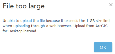 When attempting to upload tile packages exceeding 1 GB, you will see the following message. If the tile package exceeds the size limit for web uploading, upload the package using ArcGIS for Desktop (described below).