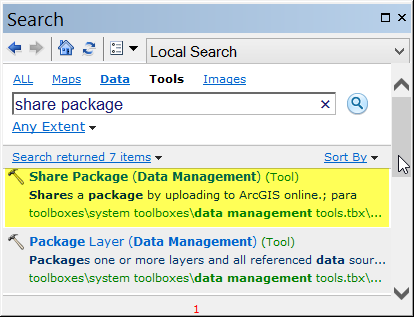 Enter “share package” and locate the Share Package (Data Management) tool, highlighted in yellow below.