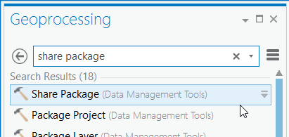 In the Geoprocessing pane, enter “share package” in search to locate Share Package (Data Management) highlighted below.