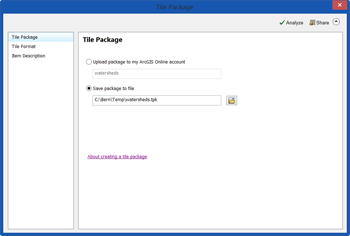 - Tile Package: Choose to upload the tile package directly to your ArcGIS Online account, or save the tile package locally and upload it later.