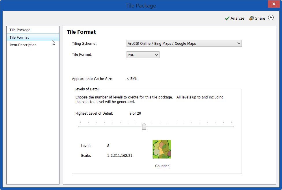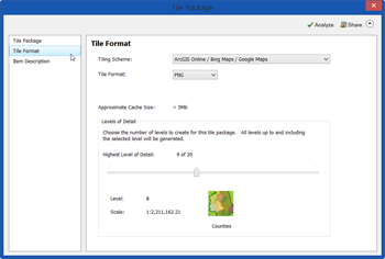 - Tile Format: Choose the tiling scheme and format. If unsure, accept the defaults. Set the highest level of detail desired for tile creation. This setting will determine the scale at which tiles will be displayed, and will change the size of the tile package – the higher the level of detail, the more tiles will be created, and the larger the package.