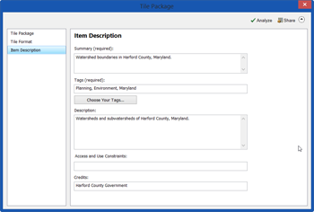 - Item Description: Include the required information for creating the tile package. If the Map Document Properties (File > Map Document Properties) have previously been completed, they will be displayed.