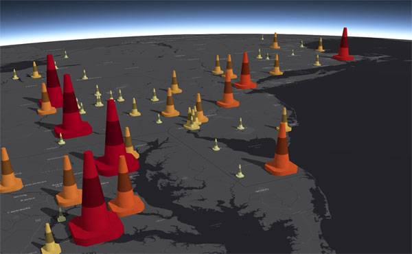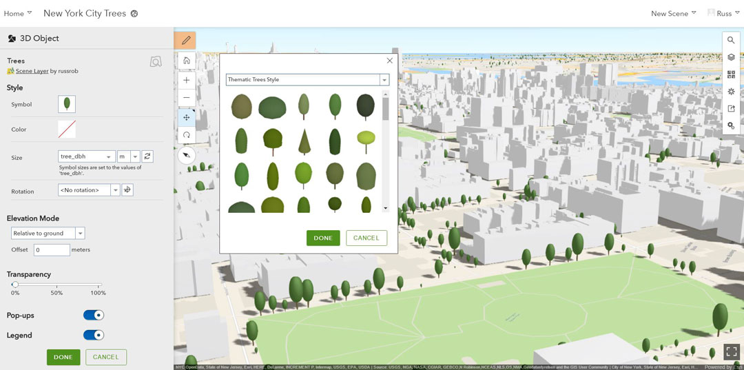 New drawing styles use attributes to drive the visualization of point layers. For instance, if you have population as a numeric attribute, you can easily visualize your data with proportional symbols for color and size based on the population value. Additionally, with the new style slider in the scene viewer you can adjust the size and color interactively.