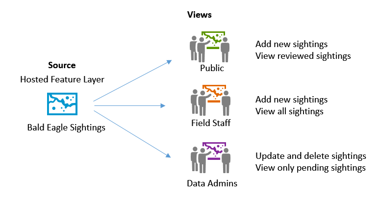 You can now create multiple views of hosted feature layers. This allows you to publish your data once, then create tailored views for different audiences. Views reference the same underlying data (the source, or primary data) but can offer different capabilities, cartography, and filtering.