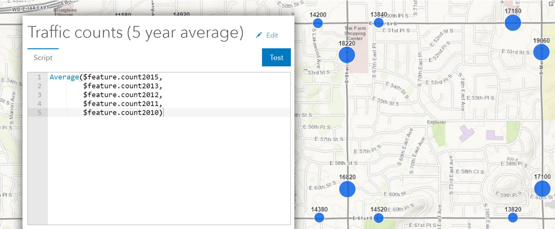 Arcade is a new lightweight expression language introduced at this release. You can author, edit, or apply custom expressions written in Arcade when styling and labeling feature layers in the map viewer. For example, an Arcade expression might be created to find the average traffic counts over a five-year period at traffic monitoring locations. Counts can then be represented using a graduated-size symbol on the map.