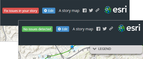 The builders for Story Map Journal and Story Map Series now automatically check your story for any issues, and enable you to troubleshoot and fix issues on the spot. A notification appears if issues are found, and the Share dialog will also list any issues and provide suggestions for fixing them. In addition, when you open an existing story map you own it is checked and a notification appears indicating status.