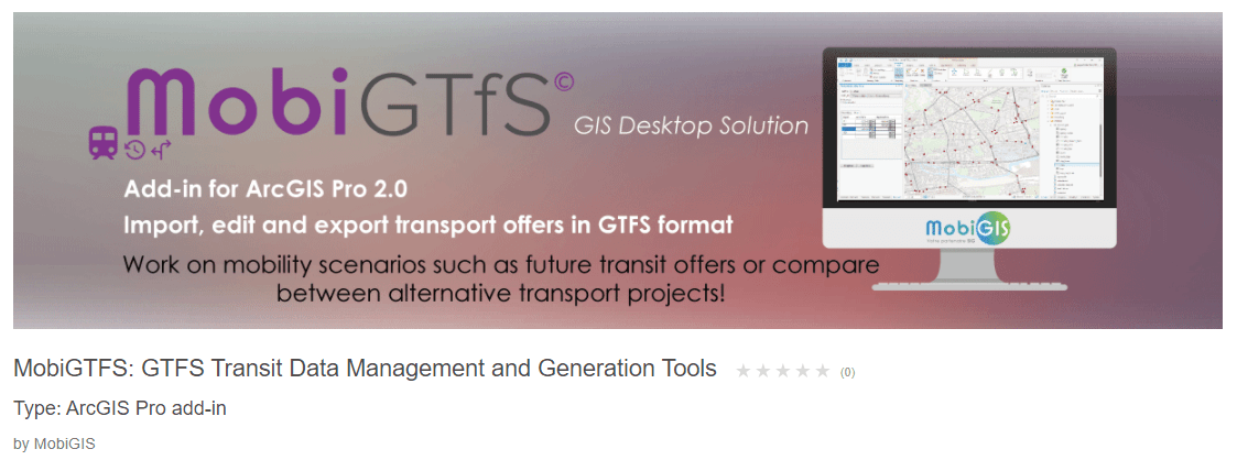 The first dedicated ArcGIS Pro add-in product listing on the ArcGIS Marketplace, MobiGTFS, can now be found on the site. The add-in, from MobiGIS, extends ArcGIS Pro and provides tools which are focused on the transportation industry.