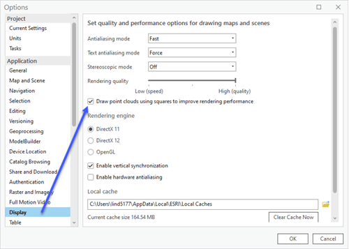 - Point clouds can now be visualized as squares instead of circles in a scene. The ability to render points as squares improves overall performance in a scene for point clouds. This parameter is accessible in the application level and found in the Display section of the Options dialog. Point clouds can either be a LAS dataset, LAS file(s), ZLAS file(s) or a point cloud scene layer.